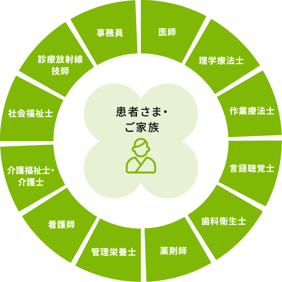 回復期リハビリテーション医療での中心は患者さまであり、その周りを各医療専門職が囲んでサポートを行います。医師や看護師、リハビリテーションセラピストなどがそれぞれの専門分野で協働を行い、お互いが情報を共有することで入院生活やリハビリテーションの充実に努めています。