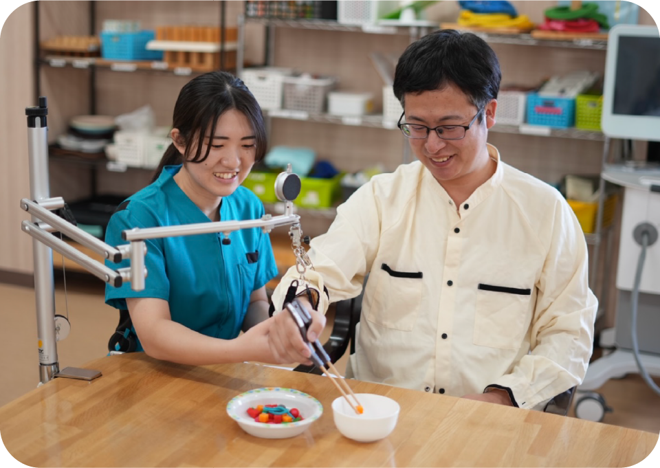 今後患者さまが生活する環境情報などをチームで共有し、生活に必要な動作を集中的に練習します。生活に必要な動作とは、歩行などの移動方法だけでなく、トイレや入浴の動作、衣類の着替え、食事に必要な動作や嚥下(食物の飲みこみ)など多岐にわたります。また一人でベッドから起きれない患者さまや重症な患者さまも下肢装具やリハビリテーション機器を用いて、積極的な活動量の確保に努めます。