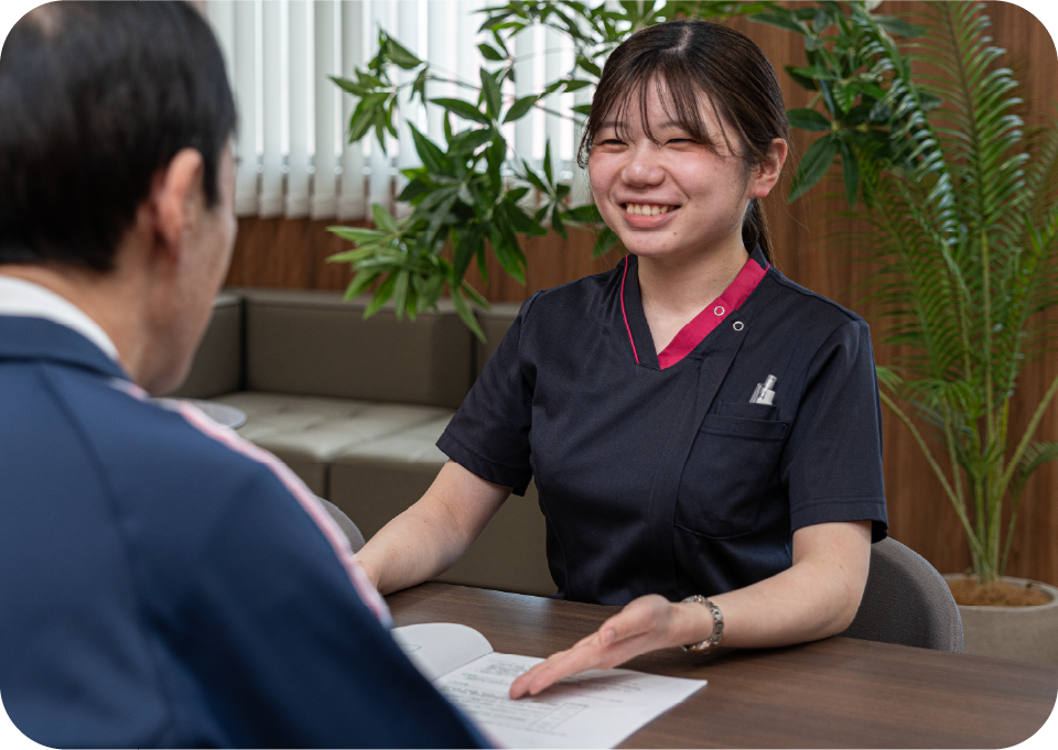 入院から退院まで、各職種の担当者を患者さま一人ひとりに決めさせていただいております。各職種窓口になる担当者を配置し、日々サポートの充実した体制になる様に努めています。入院生活だけでなく、退院の向けて各種制度(介護保険など)が必要な患者さまには、ケアマネージャーや地域の窓口などへ連絡や相談を行い、退院後の生活を見据えて支援を行います。